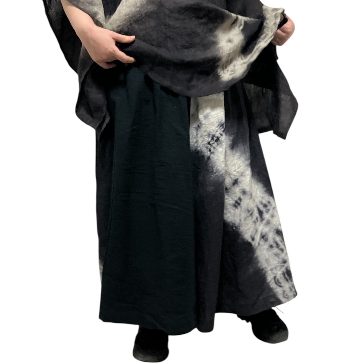 股下を深くし、ゴムと紐を入れているので、ウエストの位置でマキシ丈にもくるぶし丈にもできます。